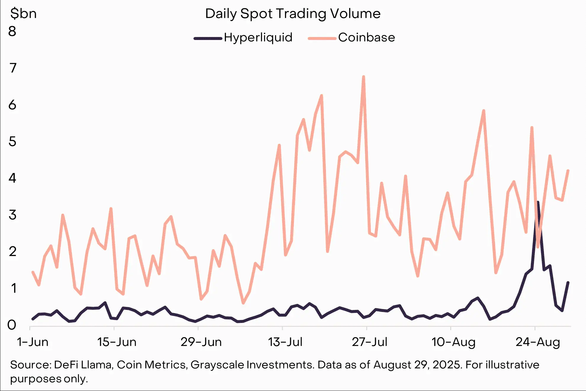部分戏剧性事件发生在 Hyperliquid,这是一家提供现货交易和永续合约的 去中心化交易所(DEX)( 背景信息请参阅 《DEX 的吸引力:去中心化交易所的崛起 》 ) 。从 8 月 20 日开始,一位比特币“大鲸”(持有大量 BTC 的投资者)抛售了约 35 亿美元的 BTC,并立即购买了约 34 亿美元的 ETH。 [6] 虽然我们无法推测这位投资者的动机,但这种规模的风险转移发生在 DEX 而非中心化交易所(CEX)是一种令人鼓舞的现象。事实上,在当月交易量最大的那一天,Hyperliquid 的现货交易量一度超过 Coinbase 的现货交易量(见图 3)。
