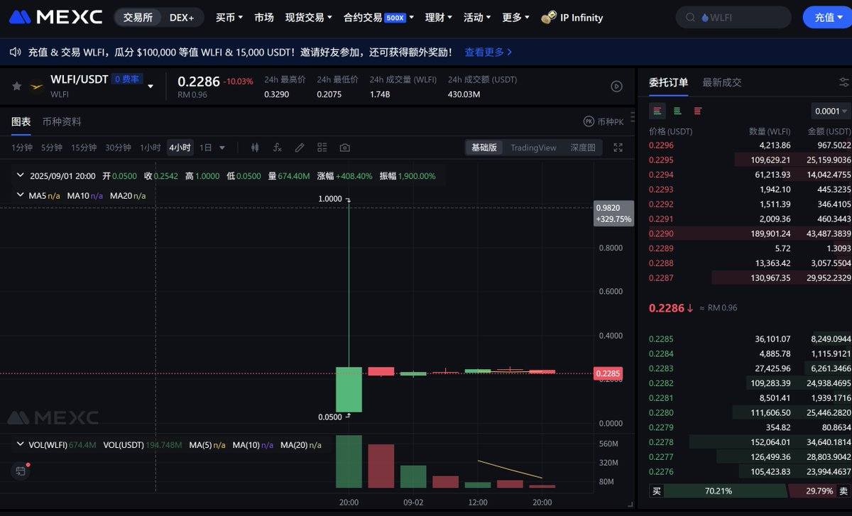WLFI 在 9 月 1 日登陆多家交易所,火币和 WEXC 提前约一小时开盘,价格几乎与场外交易持平。不同于其他代币先上涨再回调的走势,WLFI 直接从 $0.30 跌至 $0.21–$0.25,并最终稳定在 $0.24 左右。