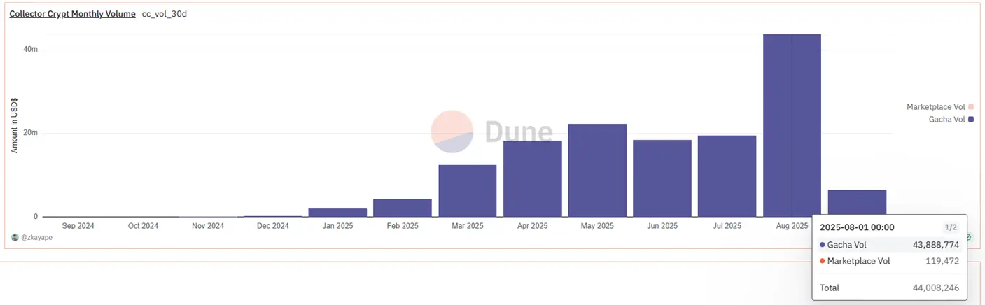 在 Collector Crypt 的月度总销售额柱状图上,来自卡片交易市场的份额几乎是完全看不到