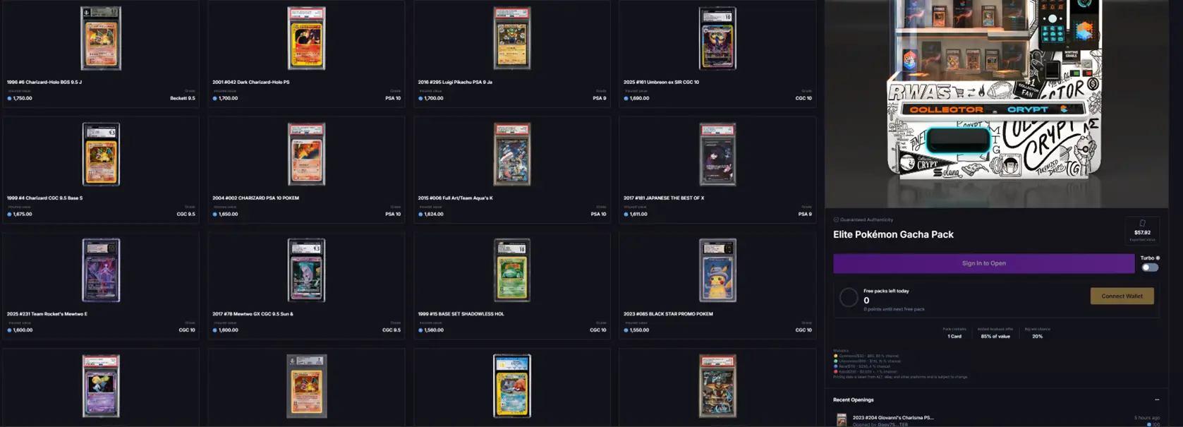 上图就是 Collector Crypt 的宝可梦卡片扭蛋机系统。花大约 60 美元,有 80% 的概率抽到价值 30 至 60 美元的卡片,15% 的概率抽到价值 60 至 110 美元的卡片,4% 的概率抽到价值 110 至 250 美元的卡片,1% 的概率抽到价值 250 至 2000 美元的卡片。