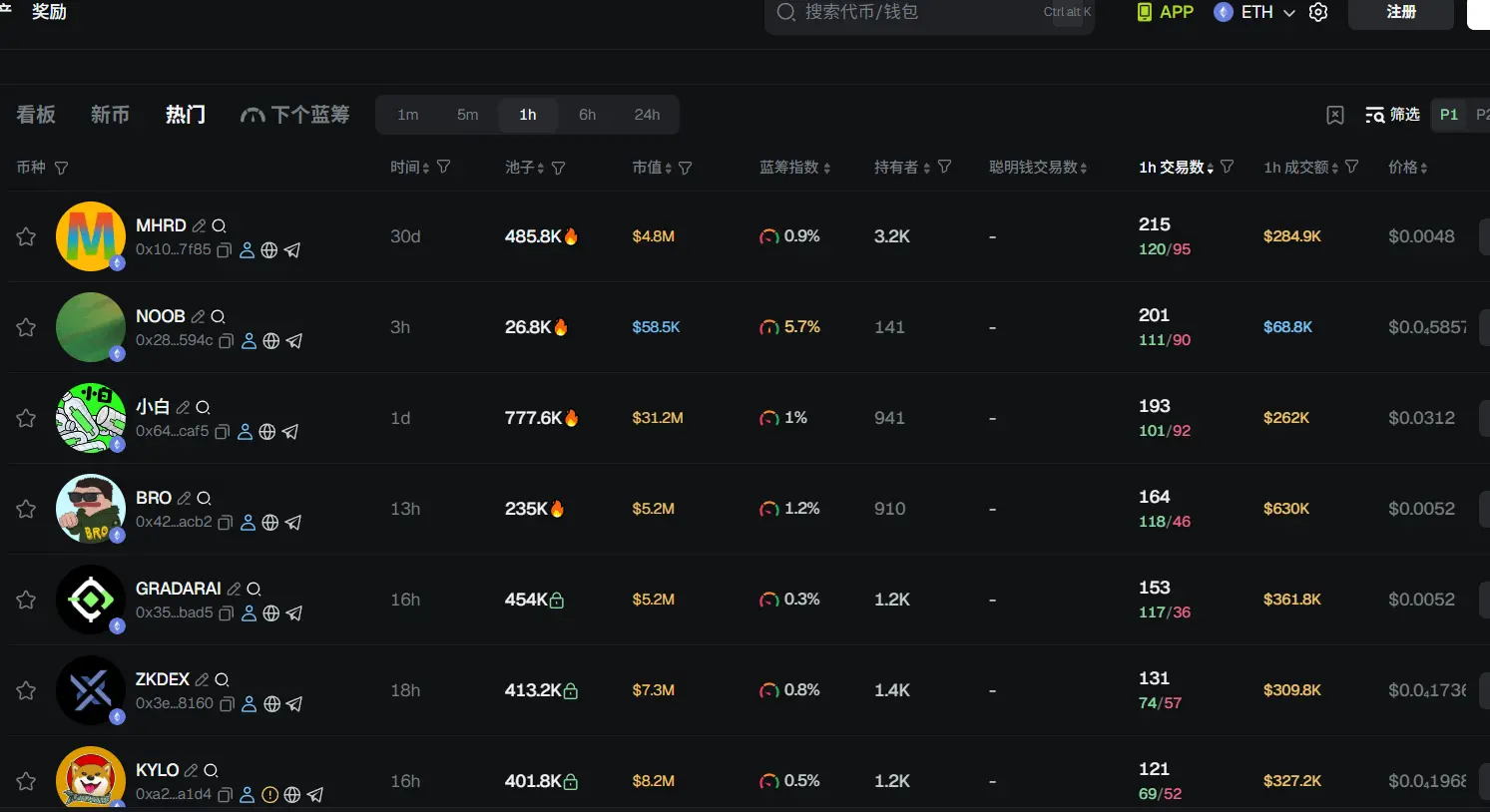 过去 24h 以太坊热门代币前五依次为:MHRD、NOOB、小白、BRO、GRANDARAI