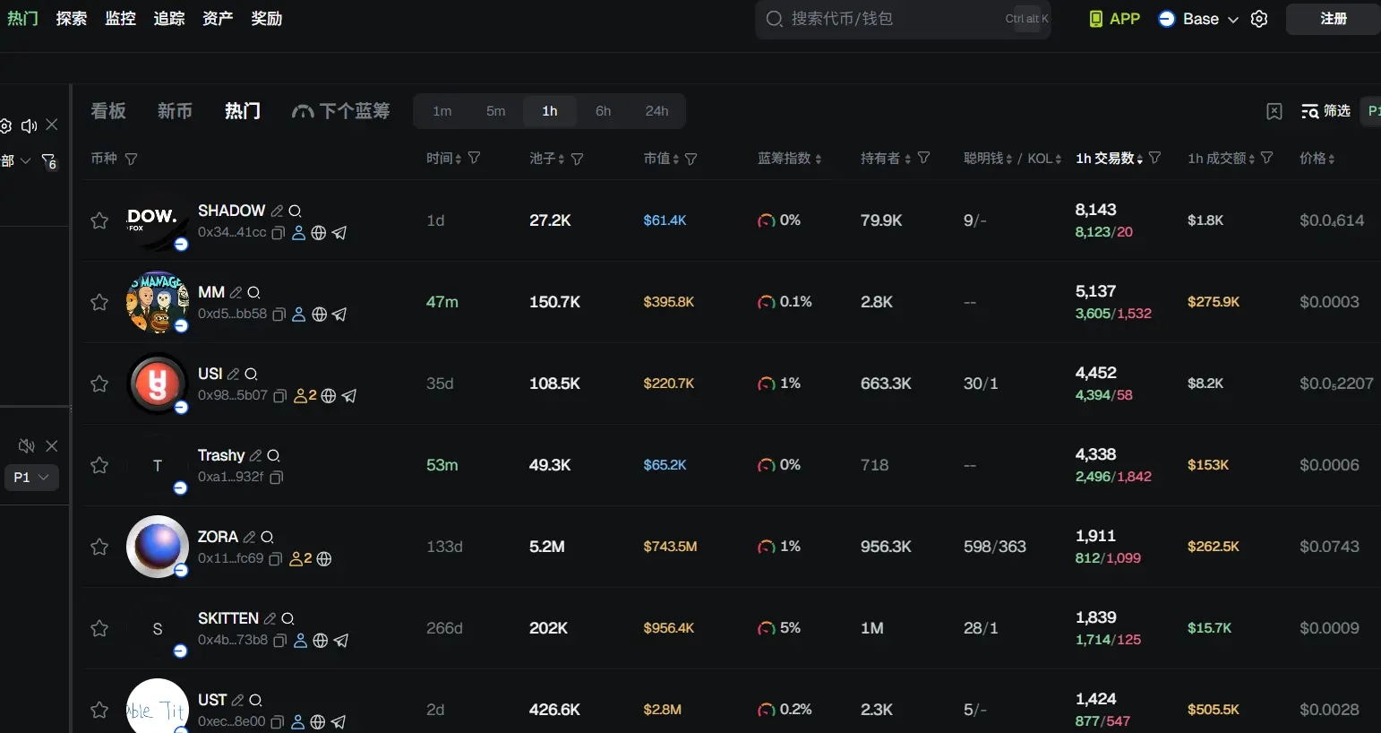 过去 24h Base 热门代币前五依次为: SHADOW 、 MM 、USI、 Trashy 、ZORA