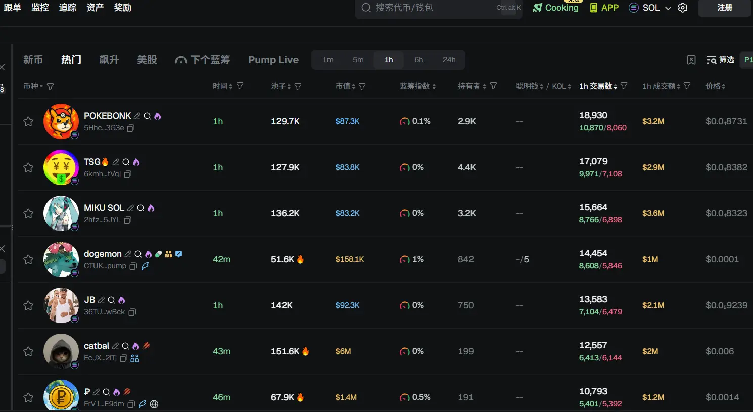过去 24h Solana 热门代币前五依次为: PKEBONK 、 TSG 、 MIKU SOL 、 dogemon 、 JB