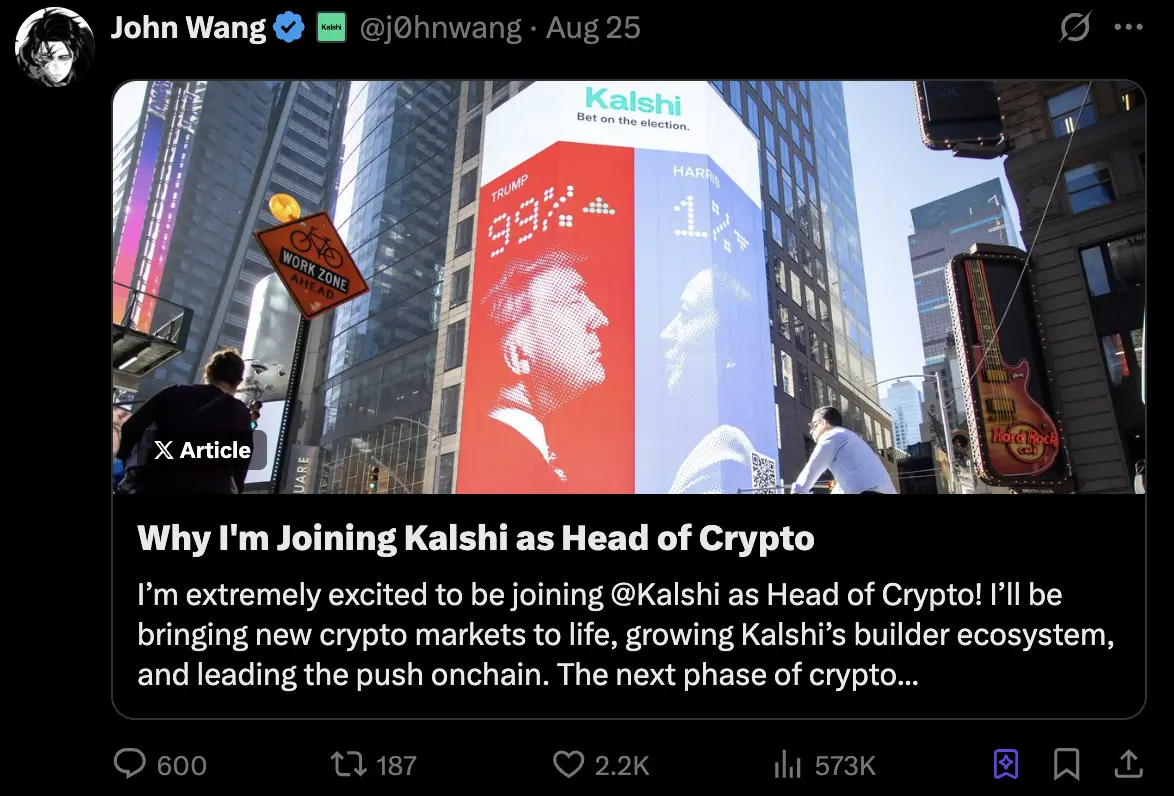 不过,这种高度合规与中心化的路径也让 Kalshi 面临另一重挑战:如何在保持稳定性的同时吸引加密原生用户。为此,它在近期特意任命加密 KOL John Wang 为「Head of Crypto」,试图打通与 Web3 社群的桥梁。但这种尝试能否成功,尚未有定论。某种意义上,Kalshi 是「制度派」的代表,它以合规与机构信任为核心优势,但在灵活创新与去中心化社区建设上,目前仍落后于 Polymarket。