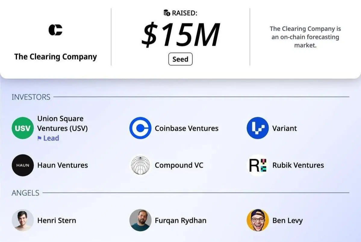 在此背景下,8 月 27 日,The Clearing Company 宣布完成 1500 万美元种子轮融资,由 USV 领投,Coinbase Ventures 等知名机构跟投。更引人注目的是,它的核心团队成员来自 Kalshi 与 Polymarket——CEO Toni Gemayel 曾先后担任两家「死对头」平台的增长主管。Clearing Company 的目标,是把 去中心化的开放性 与 合规监管的可信度 融合在一起,打造出一个既能被散户接受、又能获得监管青睐的新一代预测市场。