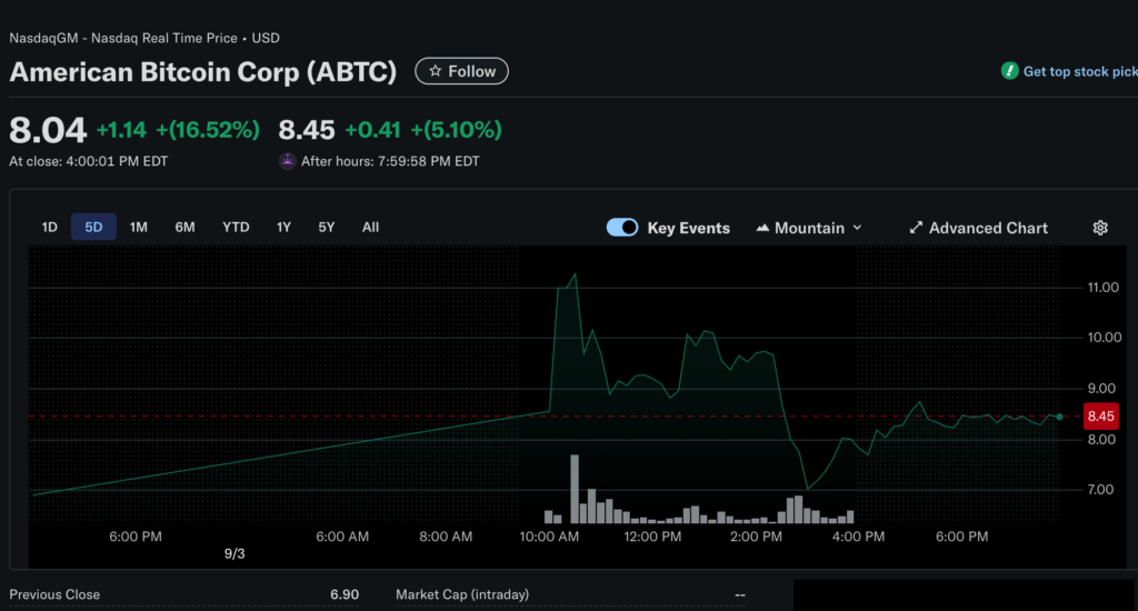 美 国总统川普家族成员艾瑞克‧川普支持的 American Bitcoin (ABTC) 在美国时间 3 日于那斯达克挂牌,揭𫔭政治势力挺进加密矿业的序幕。昨晚股价𫔭盘约 6.9 美元,盘中最高触及 14 美元,涨近 90%,最终收报 8.04 美元,仍比𫔭盘价高出 17%,成交量达 2,900 万股,屡次触发熔断。