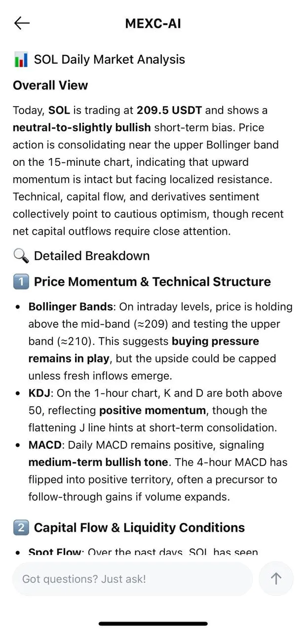 无论你是看好某币种并计划短线操作,还是持续跟踪某代币以考虑布局,都可以向 MEXC - AI 提问,例如:“今日 XXX 币行情如何?”或“分析一下 XXX 币最近的走势和技术面情况。” MEXC - AI 会提供逻辑严谨且全面的分析: