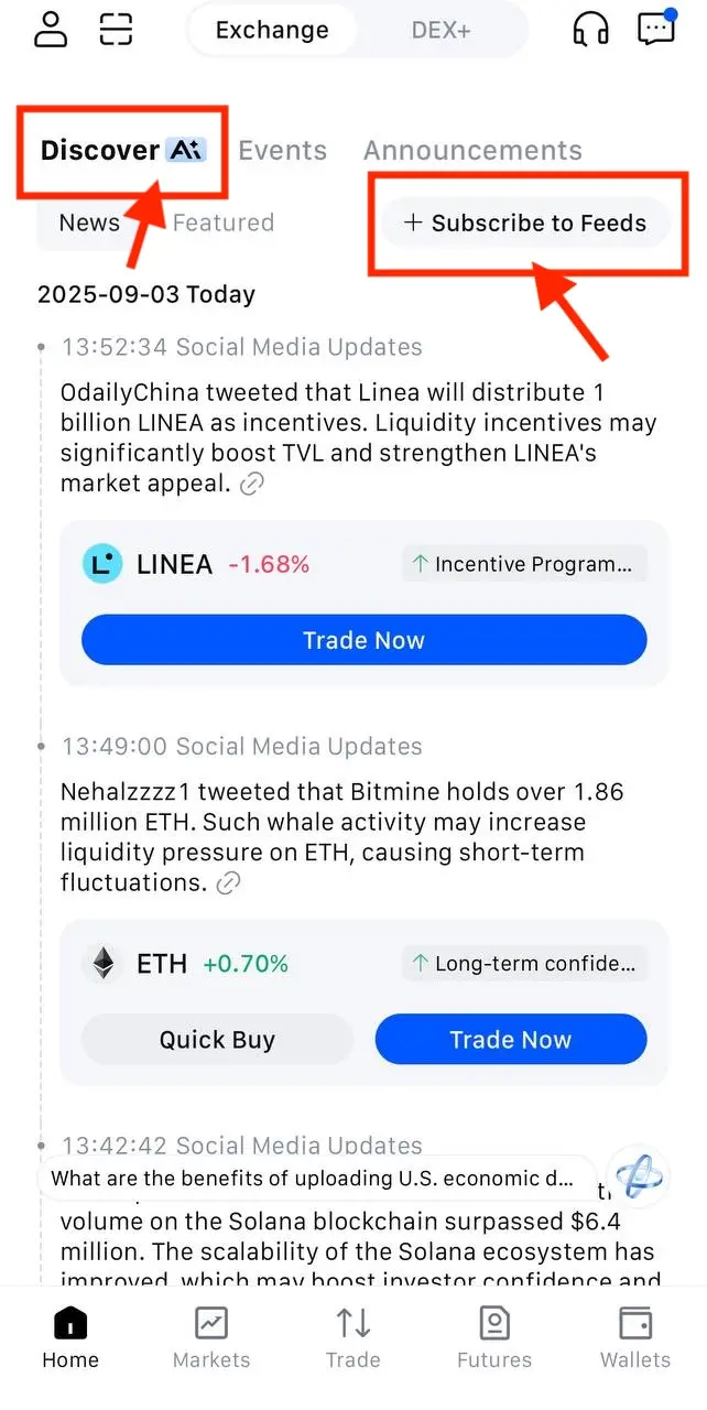交易的核心是对市场信息消化过程的时间差套利。 MEXC 的 AI 快讯系统不仅能实时捕捉关键信息,还提供深度解析,助力交易者在市场全面反应前建立先发优势,抢占“快人一步”的窗口期,这在高波动市场中往往决定盈亏成败。