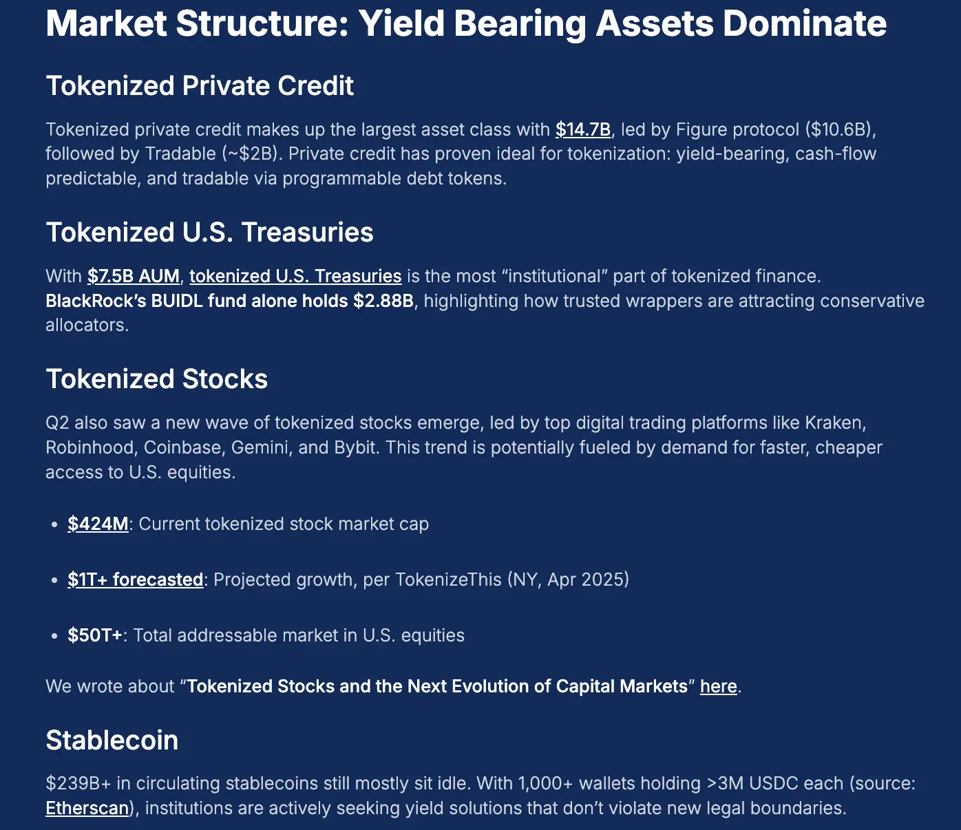 贝莱德(BlackRock)推出了代币化的国债,Figure Technologies已将数十亿美元的私人信贷上链,而从新泽西到迪拜的房地产交易正在被分割并在去中心化交易所进行交易。