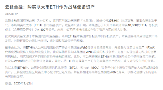 正因于此,在港股市场,云锋金融始终被人标记为“马云概念股”,其股价变动与阿里系企业基本保持一致。9月2日,云锋金融集团发布公告,表示公司已通过自有资金购置1万枚ETH作为战略储备,未来还将持续推动加密资产战略化与数字化金融创新,并探索将 BTC、SOL 等主流代币纳入储备。该集团同时表示,计划将数字资产与自身业务深度结合,探索 RWA代币化以及区块链技术在保险、资管等核心业务中的潜在应用,为公司构建“金融+科技”的生态闭环。