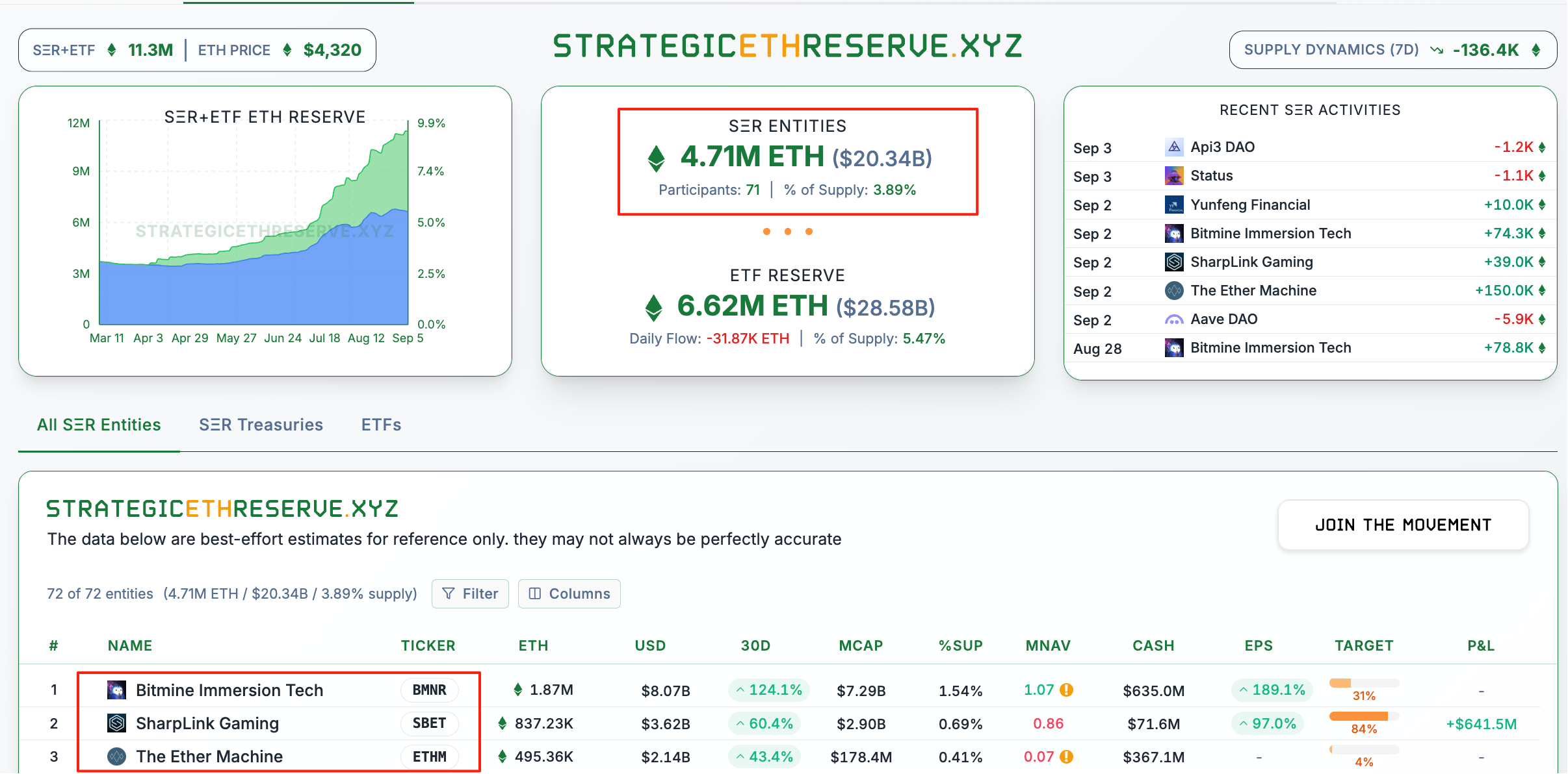 据 Strategicethreserve 网站数据 ,目前,ETH 储备上市公司 ETH 持仓量达到 471 万枚,价值 203.4 亿美元,占 ETH 总供应量的 3.89%,参与公司数量增加至 71 个,但就各大上市公司的股价表现而言,ETH 储备策略能否持续生效,仍然有待验证。