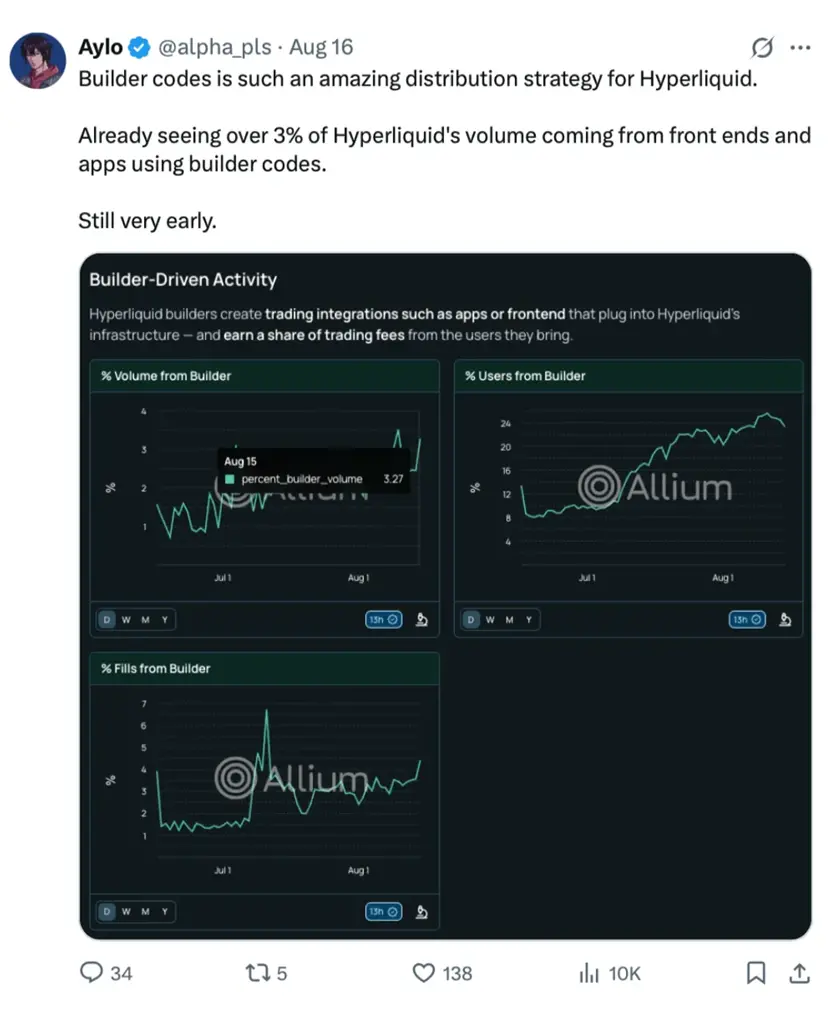 这一机制允许开发者使用 Hyperliquid 基础设施构建交易应用,并从他们引导的交易中获得费用分成, 将 DeFi 建设者转变为 Hyperliquid 的分销合作伙伴,形成真正的双赢模式。