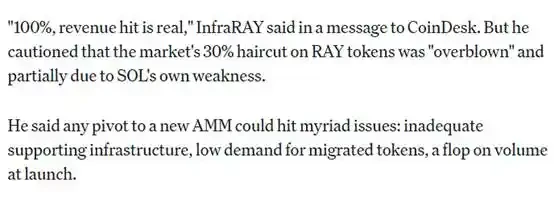 在回复 CoinDesk 时,@0 xINFRA 持续表示对 Raydium 来说分手没那么糟糕,并表达他对 pump.fun 的担忧,「任何新的 AMM 都可能遇到无数问题:基础设施不完善、迁移代币需求低、交易量下降。」