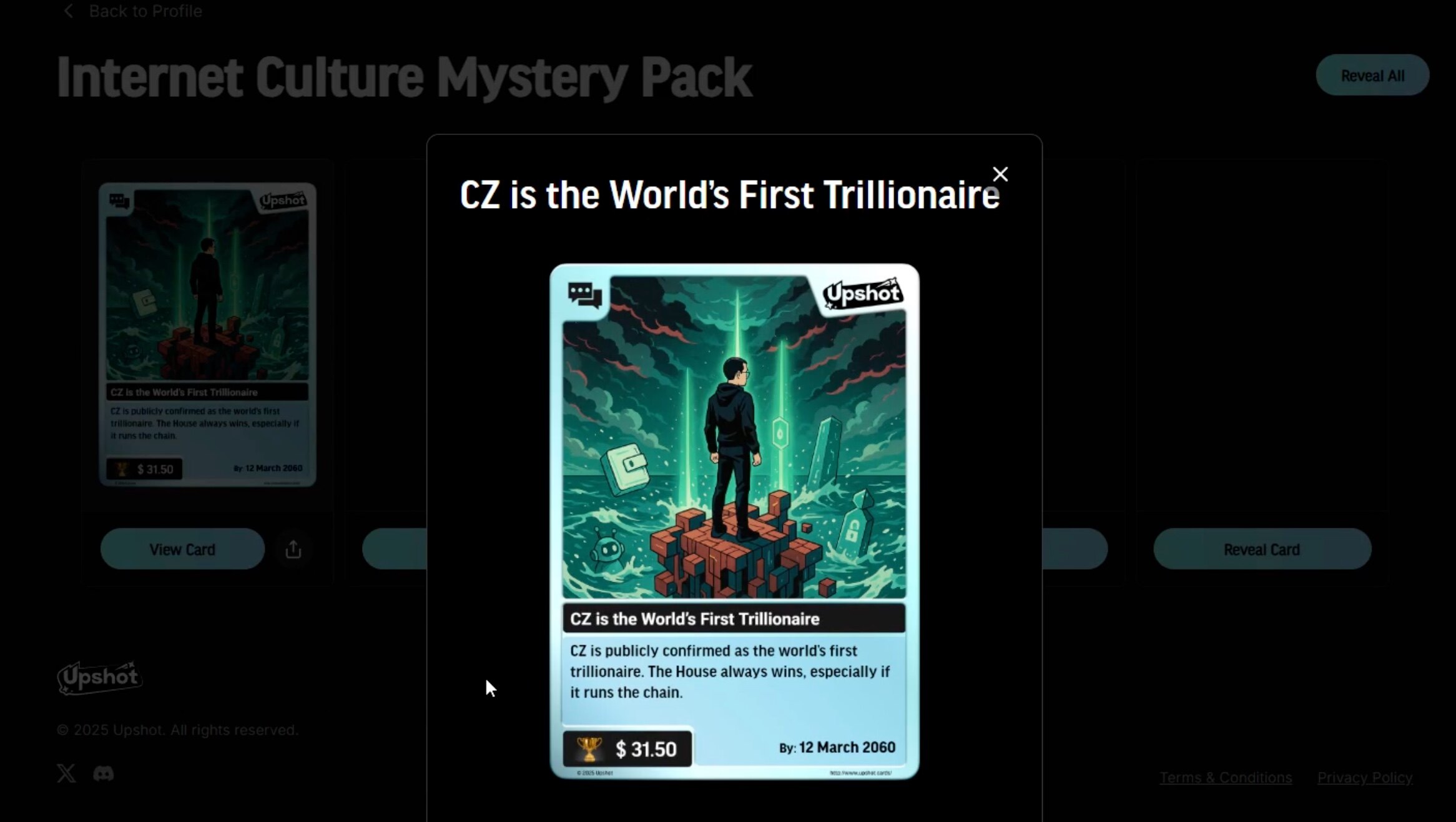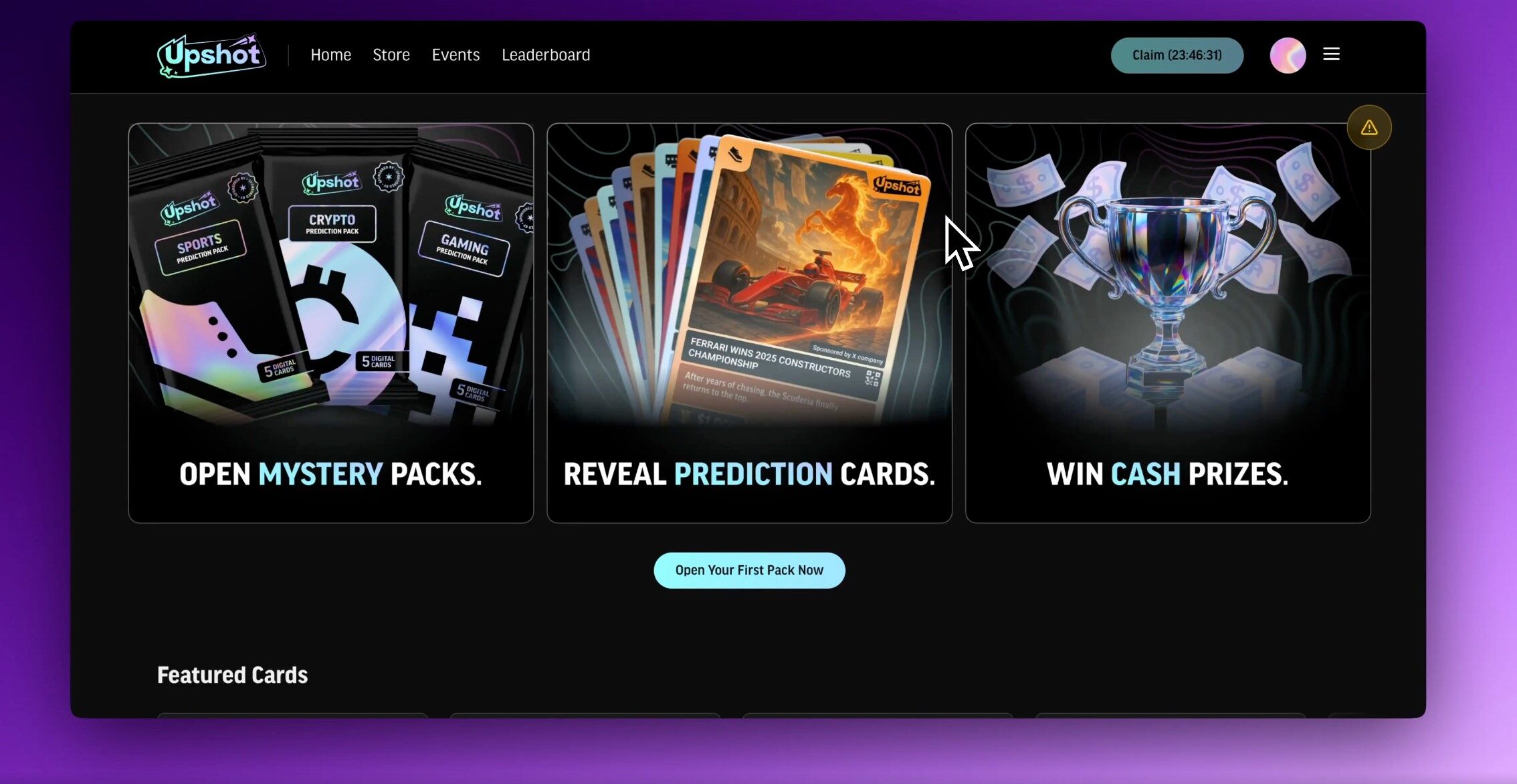 简介: Upshot 是一款预测卡协议,个人认为更像一种抽卡游戏,用户可以在其平台购买 Packs 礼包,Packs 包括预测卡、现金或其他现实世界资产,可能是门票/商品等。该游戏结合了卡牌、预测市场和现实世界资产。每张卡包含了预测的内容和奖金,需要 Claim 领取。