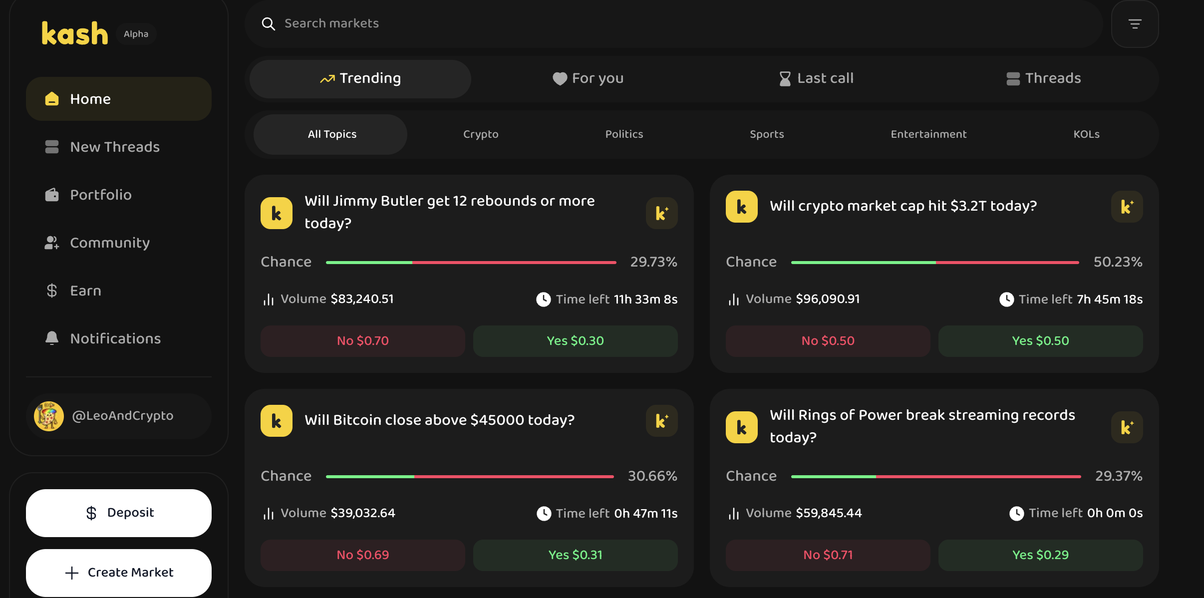 DM 或者@kash_bot 获取邀请链接,或进入网站,先通过 X 注册早期资格,然后将页面拉至最下方 Get early access to Kash,通过 X 登录,然后可通过交易所或者钱包将 Base 网络上代币存入自动生成的非托管钱包内,支持代币为 USDC(存入的 ETH、WETH、DAI 将自动转换为 USDC)存入即可立即加入预测事件,无最低金额限制,提款无锁定期,且零 Gas。预测事件类型分为加密货币、政治、体育、娱乐等,结算通过 USDC,存款提款方式也很简单快速。