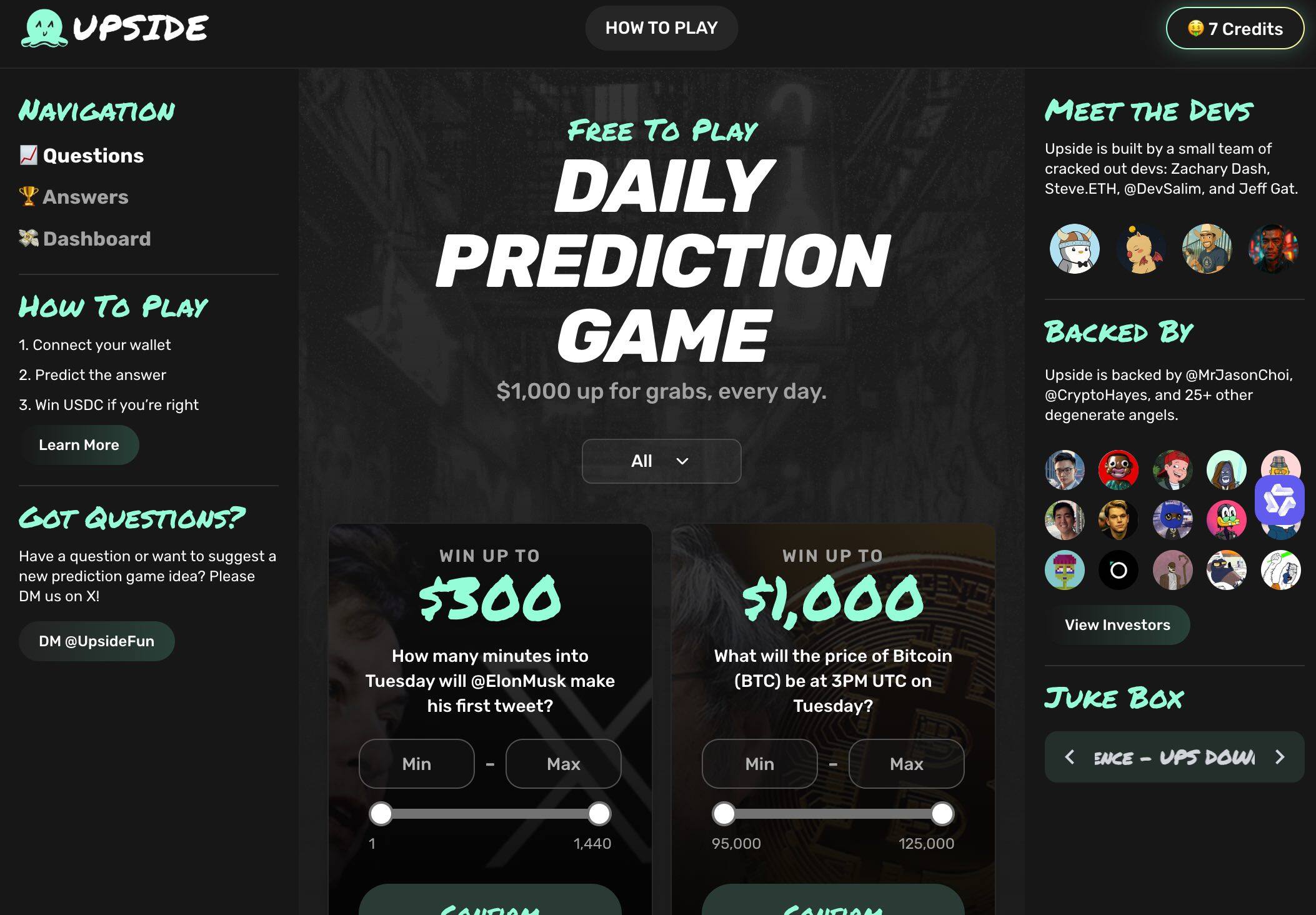 参与方式: 获得邀请链接,或者大家想体验可私信 我的 X 账号 (扛单大王),DM 我你的钱包地址(我来推荐大家进入资格,参与 Upside),获得资格后用钱包登录会有相应的积分(Credits),每个积分可参与一次预测。每日共 1000 美元奖池,可领取积分参与。