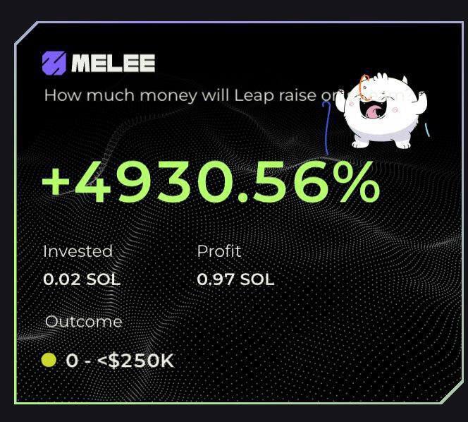 简介: Melee 是 Solana 上的预测平台,据其官方介绍,Melee 是 pump.fun 和 Polymarket 的结合体,将预测转为 Meme 的形式,任何用户都可以创建一个预测市场,事件与 Meme 币挂钩。本质上是将注意力代币化,不仅能对预测事件进行下注,还可以通过 Meme 的传播性来增加其流动性和交易,很好地解决了中长期的预测事件的短时流动性不足,可以在长期预测事件上获得短时高收益,值得关注。