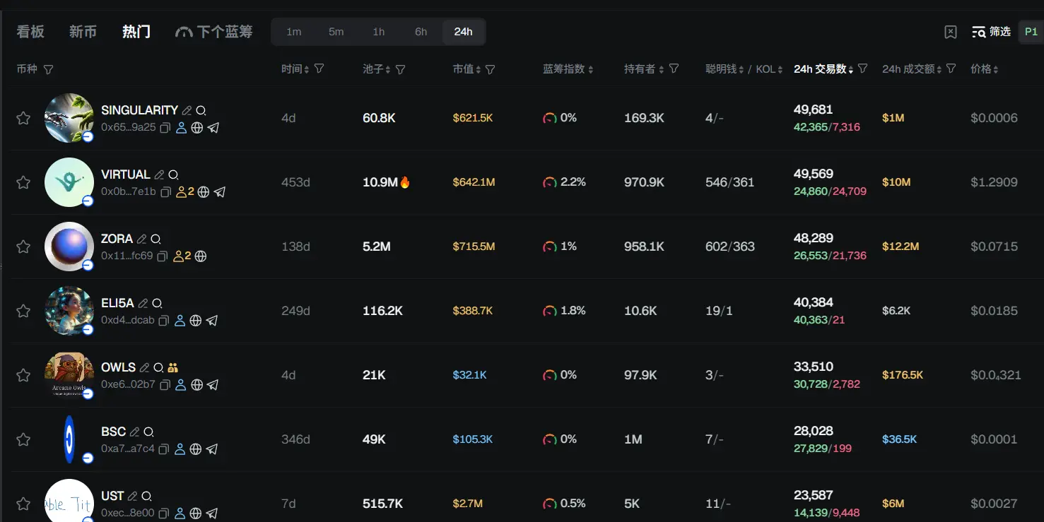 过去 24h Base 热门代币前五依次为: SINGULARITY 、VIRTUAL、 ZORA 、ELI5A、 OWLS