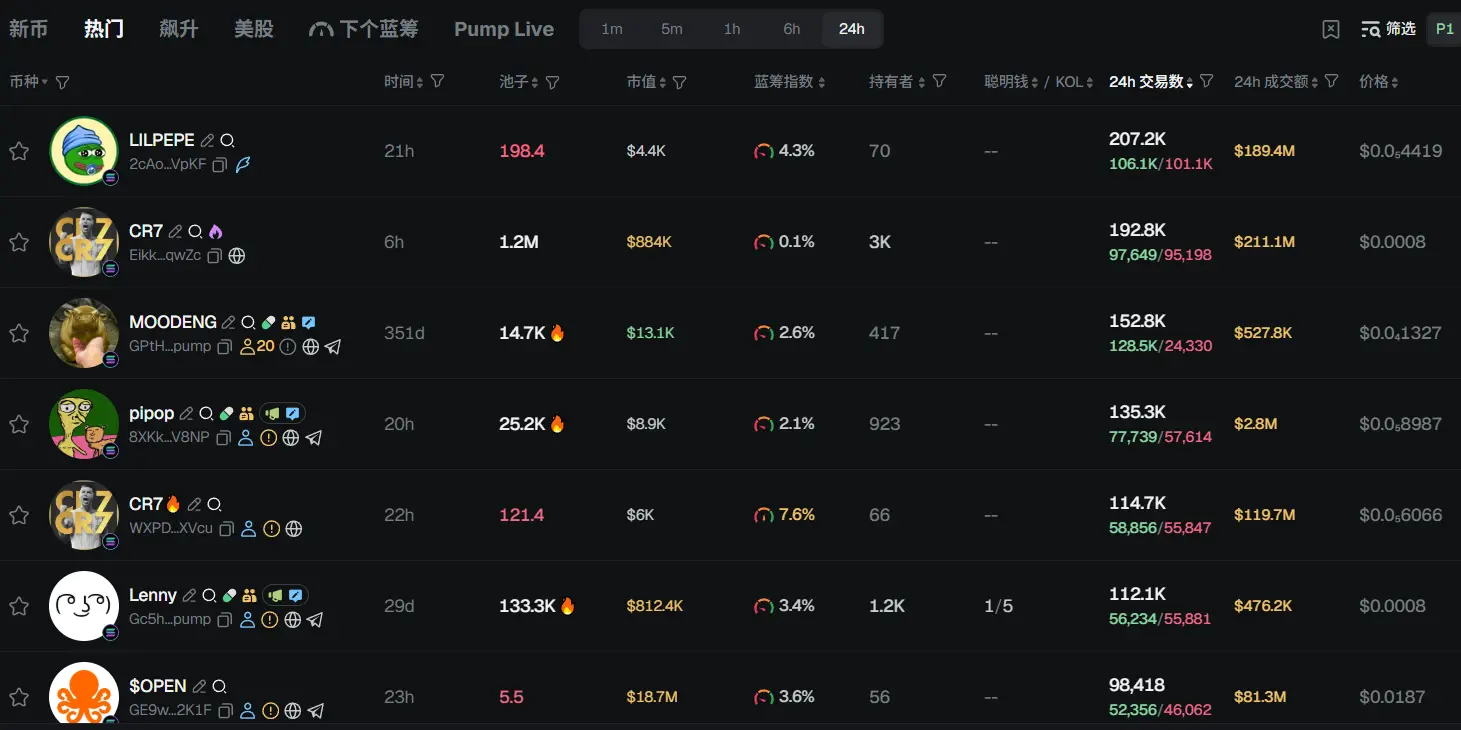 过去 24h Solana 热门代币前五依次为: LILPEPE 、CR7、MOODENG 、pipop、CR7