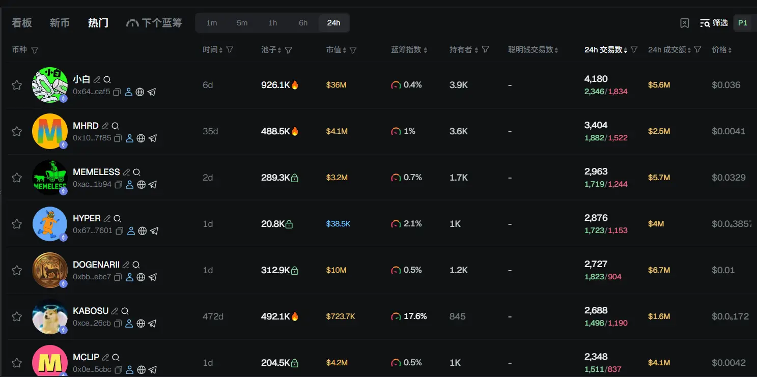 过去 24h 以太坊热门代币前五依次为:小白、MHRD、MEMELESS、HYPER、DOGENARII