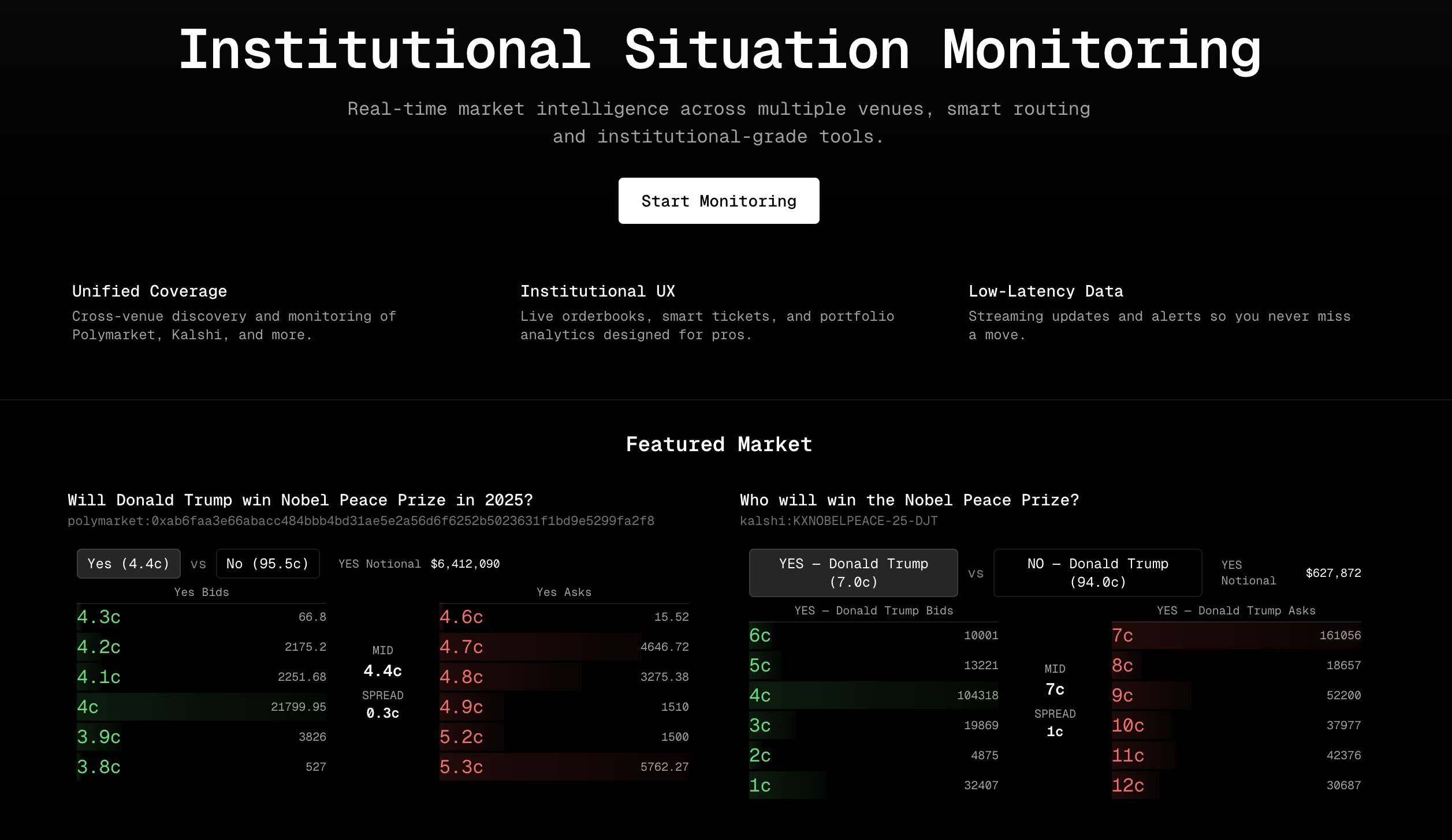 @rileyxcook 开发的 monitorthesituation.lol 实现了跨平台实时订单簿展示,并能自动匹配 Kalshi、Limitless 和 Polymarket 上的相似市场,让交易者一眼就能发现价格差异。