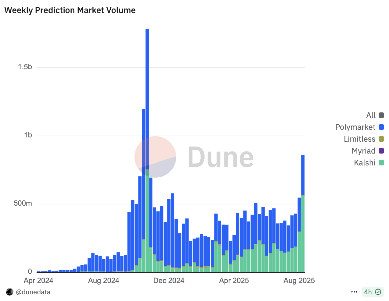 此刻,竞争格局也在悄然生变。Kalshi 招揽了加密圈知名 KOL John Wang 担任 Head of Crypto 后,表现亮眼。自 8 月 25 日起,其周交易量开始反超 Polymarket,两大巨头的较量愈发激烈。