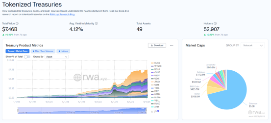 看似私人信贷位于首位,但实则仅链上房贷Figure一家在私人信贷中的规模就达到155亿美元,但其仅仅是将核心产品HELOC 抵押贷款后在Provenance链上记录交易,严格意义上而言,仅仅是将数据上链,并非纯正的RWA企业。因此,在RWA领域,最吸睛的赛道,仍然是美国国债。