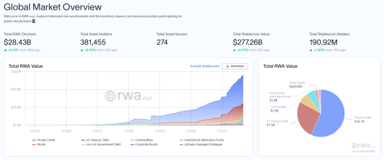 根据Rwa.xyz数据,在剔除稳定币之后,链上RWA的总规模已达到284.4亿美元,相比22年的19.29亿美元,飙升14.74倍,资产发行人达到274个,总资产持有者超过38万人。从资产类别而言,私人信贷是RWA的核心领域,规模为161亿元,占比达到56.61%,美国国债以75亿美元位居第二,后续以此为商品(20亿)、机构替代基金(18亿)、公共权益(420万),非美国国债与企业债券涉及最少,两者之和仅有60万美元。