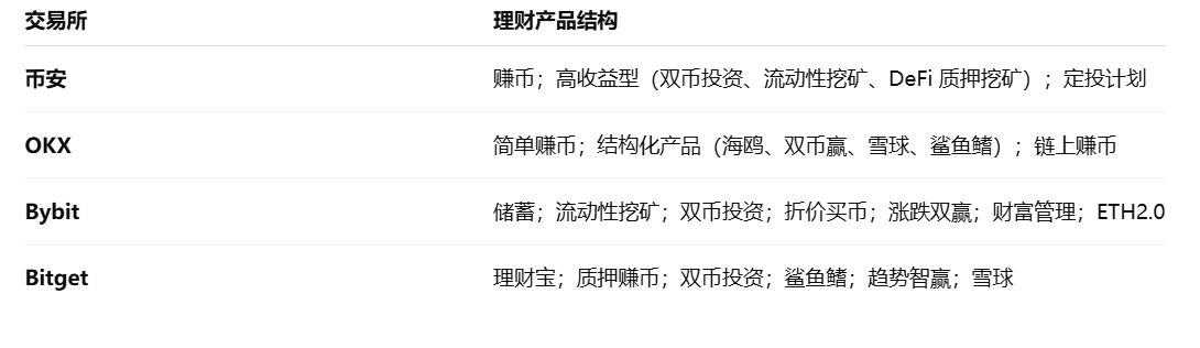 在 CeFi 阵营中,除了传统的现货交易、高风险合约交易和高门槛期权交易之外,头部交易所几乎都已经构建了各具特色的理财矩阵,涵盖赚币储蓄、结构化产品,以及链上/链下融合的资管服务。