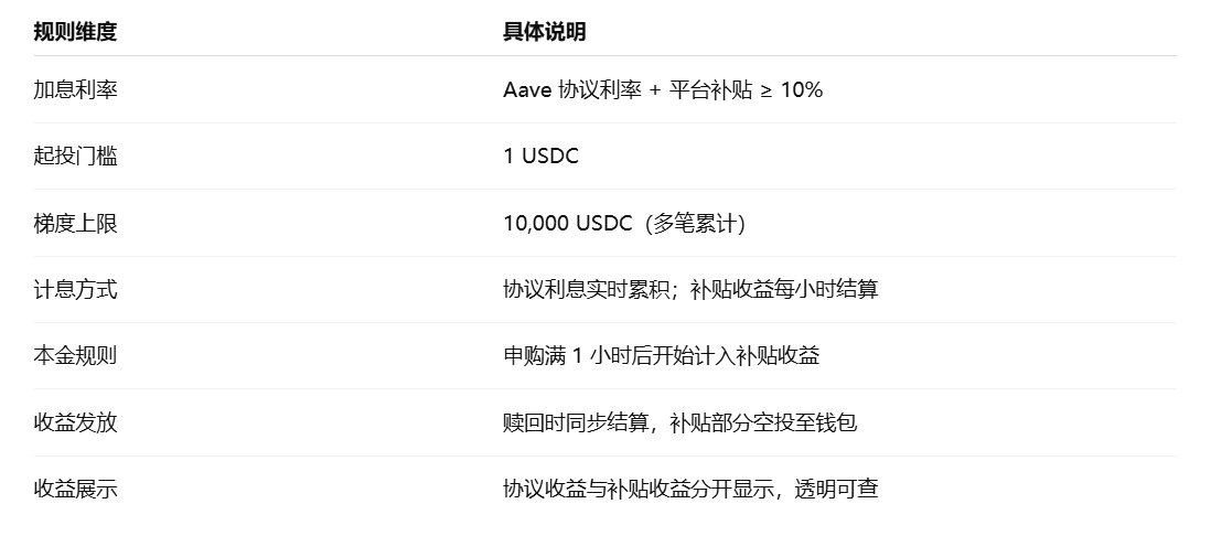 这种模式的关键在于,它并非单纯依赖短期补贴,而是把「DeFi 利息+平台补贴」制度化,更强调透明性与可持续性, 用户只需 1 USDC 即可申购:整体收益 一部分来自资金存入 Aave 协议产生的真实链上借贷利息,另一部分则由平台提供一定程度的收益补贴,确保最终年化不低于 10%。