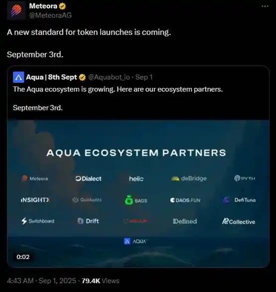Meteora 官推引用转推了 Aqua 的推文对该项目进行了宣传。