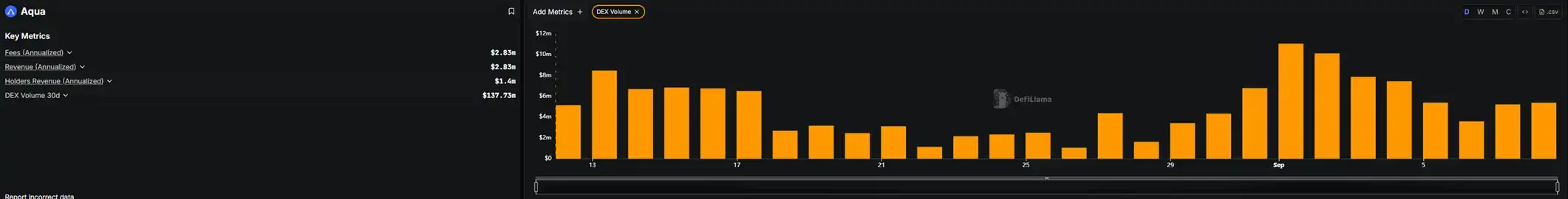 相比于过往的「Rug Pull」,Aqua 要显得「正规」很多。它有真实的产品,甚至可以在 defillama 查询到该产品的相关数据。defillama 数据显示,Aqua 这个 Telegram 交易机器人在过去 30 天的成交量达到了约 1.37 亿美元,产品收入约为 283 万美元。