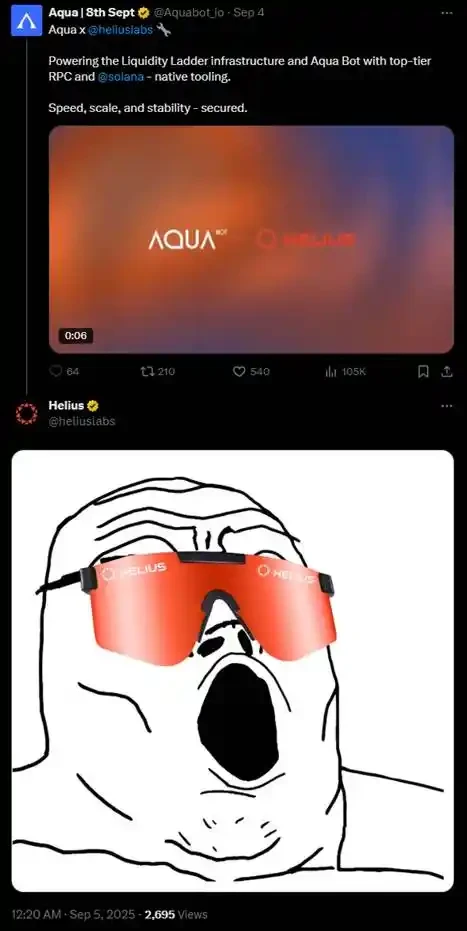 Helius 也在 Aqua 发布的合作推文下进行了回复。