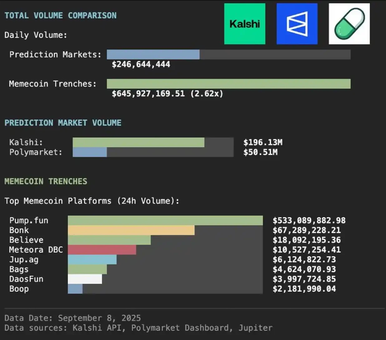 上个月刚刚入职 Kalshi 担任加密货币主管的 John Wang 在近日公布了一组数据,数据表明现在的预测市场已经达到了 Solana Memecoins 整体市场总交易量的 38%。