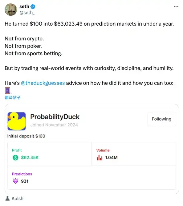 当 Meme 狂潮逐渐退去,Degen 并未收手,而是将热情转移到了预测市场上。如果你常刷 X,可能会经常看到一些所谓的「人物传」,他们通常会讲述一个人怎么用很少的钱赚到超高的倍数,这类故事的背景以前是 Memecoins 或者 DeFi 的套利,现如今换成了预测市场。