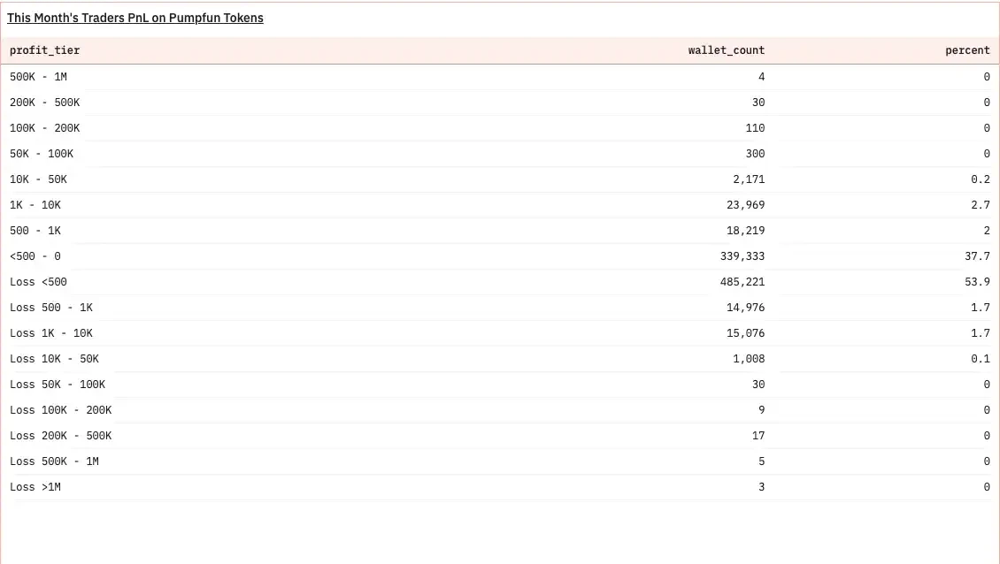参与 pumpfun 玩家的赚钱与损失比例,此前 (亏损:赚钱) 的比例在 7:3 上下浮动,而现在达到了 6:4,但赚钱和亏钱的范围几乎集中在了+—500 美元,Memecoins 的财富效应正在消失,源:DUNE