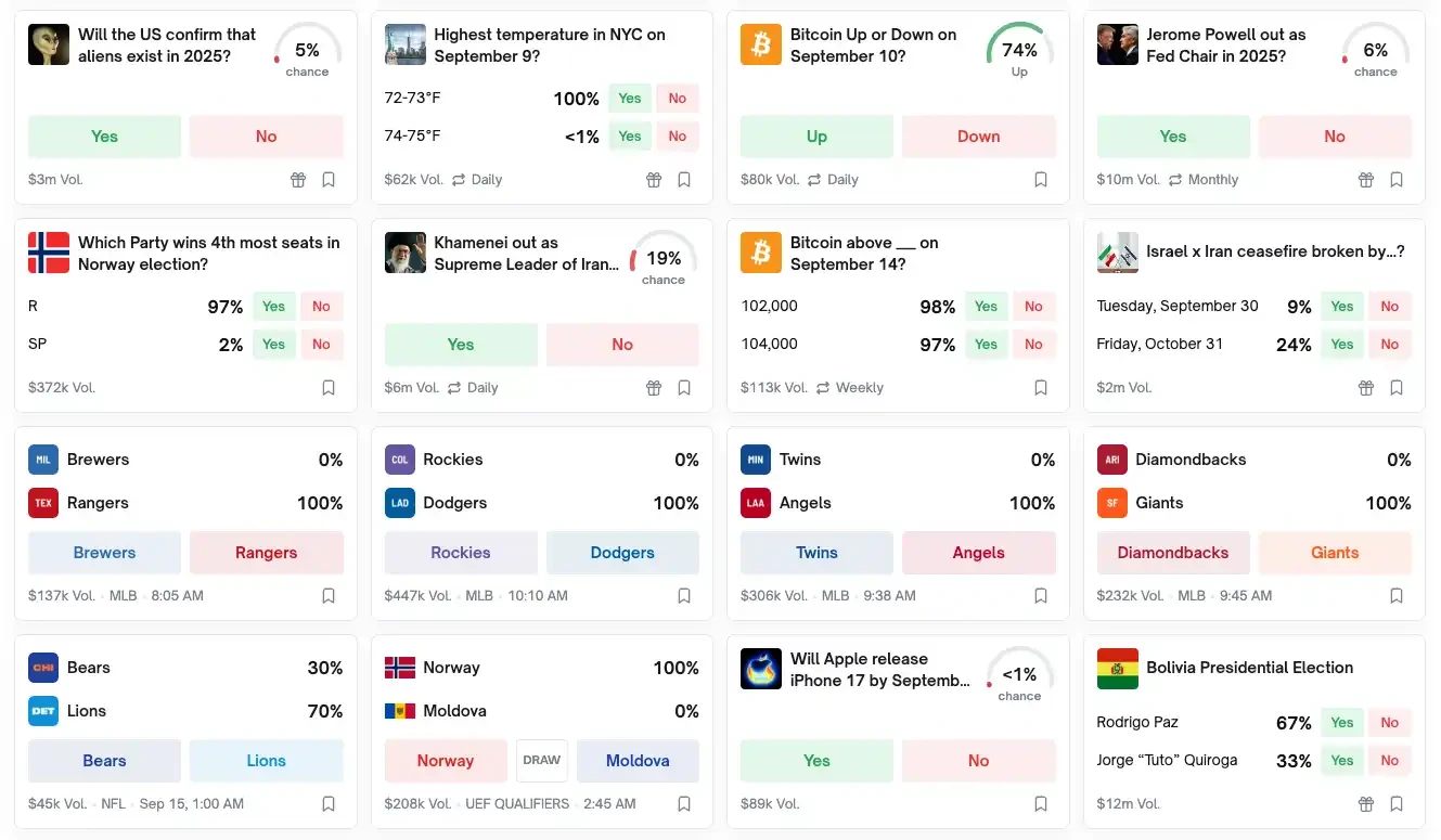 与 Memecoins 局限于炒作加密项目不同,预测市场上可交易的标的几乎无所不包,涵盖政治、经济、体育、娱乐等各个领域,满足了不同人群的「赌兴」。以 Polymarket 为例,既有严肃的宏观话题(如「比特币在某日期前是否突破历史新高」、「美联储下一次会议是否降息」),也不乏充满网络文化色彩的猎奇话题(如「一线男团 Coldplay 成员年底前是否离婚?」、「2025 年是否会被官方证实存在外星人?」)。