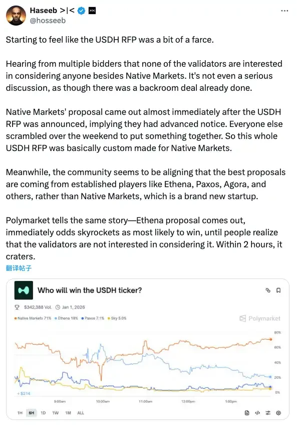 dragonfly 的合伙人 Hasseb 就 USDH 的讨论中引用了 Polymarket 的预测观点