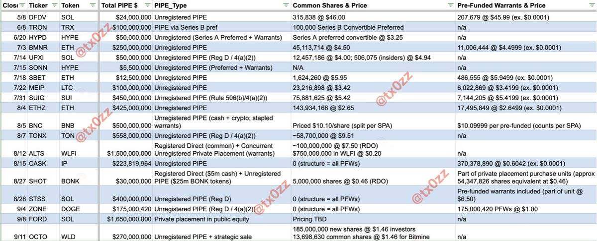 ——山寨币加密财库储备公司向 PIPE 投资者提供折扣 mNAV 入场券,并尽快解锁。