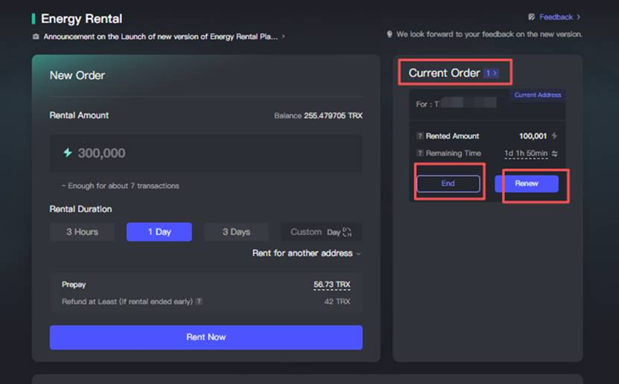 3.结束租赁,退还押金: 租赁完成后,可在“能量租赁界面”实时管理订单:支持退还租金(提前结束租赁)、延长租期(需追加费用)、查看剩余能量与租期。