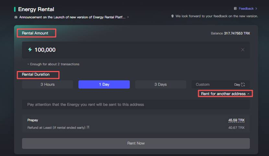 2提交租赁订单,支付预付款项: 租赁能量采用“预付款模式”,需支付三部分费用:能量租金(核心成本)、押金(租赁结束后可退还)、违约金(避免违规操作的保障金),所有费用明细实时透明,无隐藏成本。