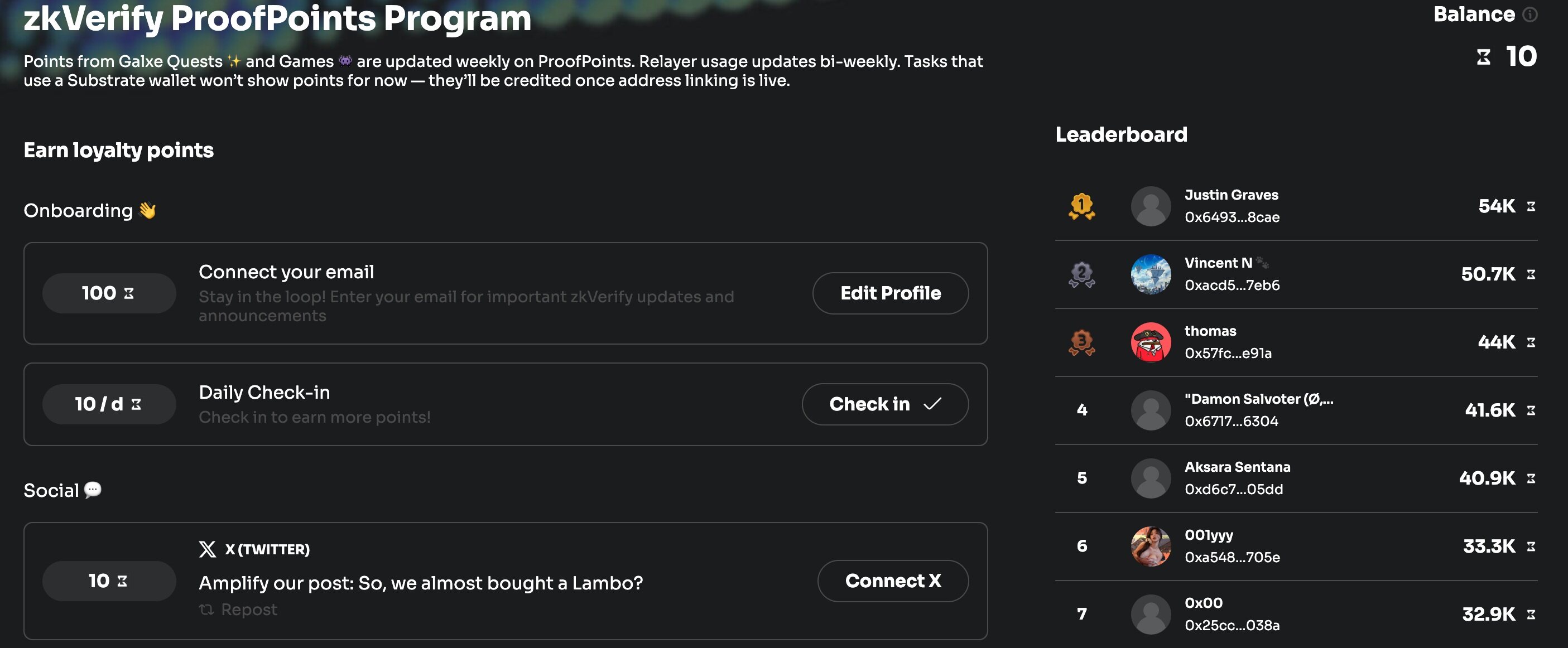 第一,zkVerify ProofPoints 活动(链接: https://points.zkverify.io/loyalty )。