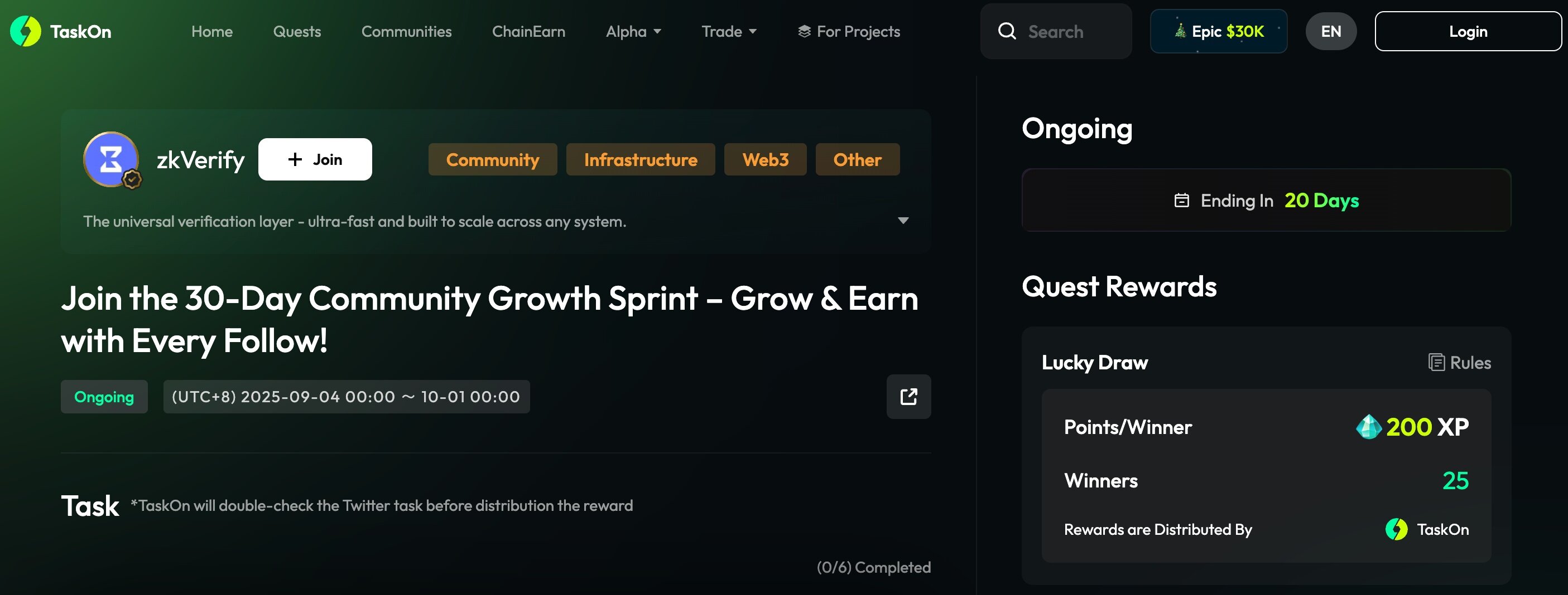 第三,zkVerify 在 TakeOn 上的任务(链接: https://taskon.xyz/quest/811092355 )。