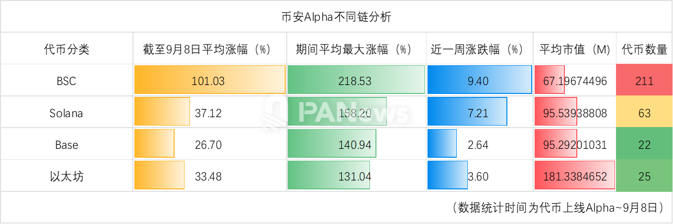 从链的分布来看,目前上线的代币当中,Base链有22个,平均涨幅达到26%;BSC链的代币数量有211个,平均涨幅达到101%;以太坊链上的代币有28个,平均涨幅约为33.4%;Solana链上的代币有64个,平均涨幅约为37%。