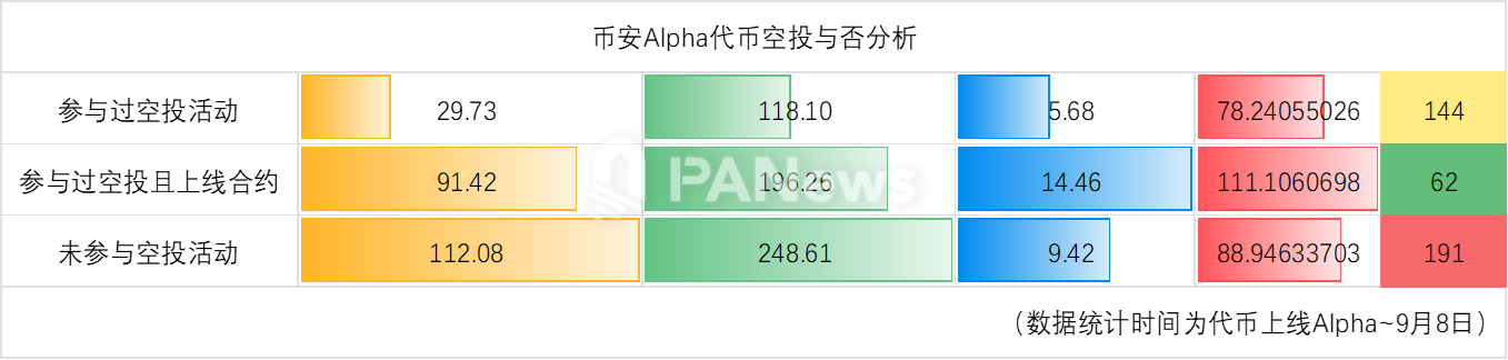 然而,当数据筛选条件为参与过空投活动、并且已经上线币安合约交易之后,这些代币的平均涨幅就达到了91%,平均最大涨幅则达到了196%。这一数据表现好于空投代币的平均水平,但又低于合约代币的平均水平。
