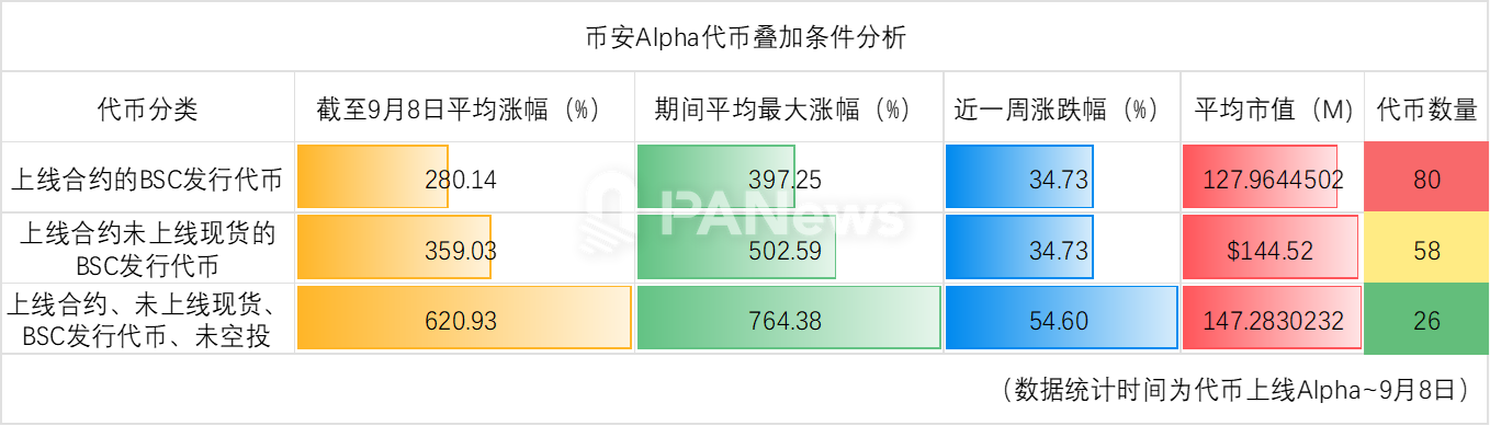 那么,回到我们的终极问题,什么样的代币可能是币安Alpha当中表现最好的类别?结合此前的分析,我们能够从多个维度当中,看到几个潜在的利好条件,分别是上线合约交易、发行于BSC链、未进行空投、未上线现货交易。