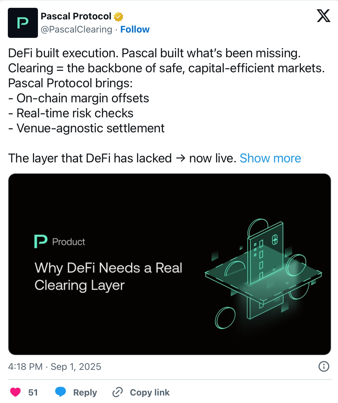Pascal 团队认为,统一清算对于解锁资本高效的 DeFi 产品至关重要。通过跨交易所与跨产品的敞口净额,保证金要求可以显著下降,类似于传统金融中的投资组合保证金如何为对冲策略释放资本。