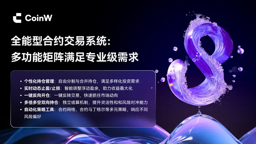 CoinW 致力于为用户的合约交易提供强大的功能支持,目前已构建了齐全、丰富且高效的合约功能矩阵,覆盖从基础交易到高级策略的全场景需求,成为众多资深玩家的首选工具。