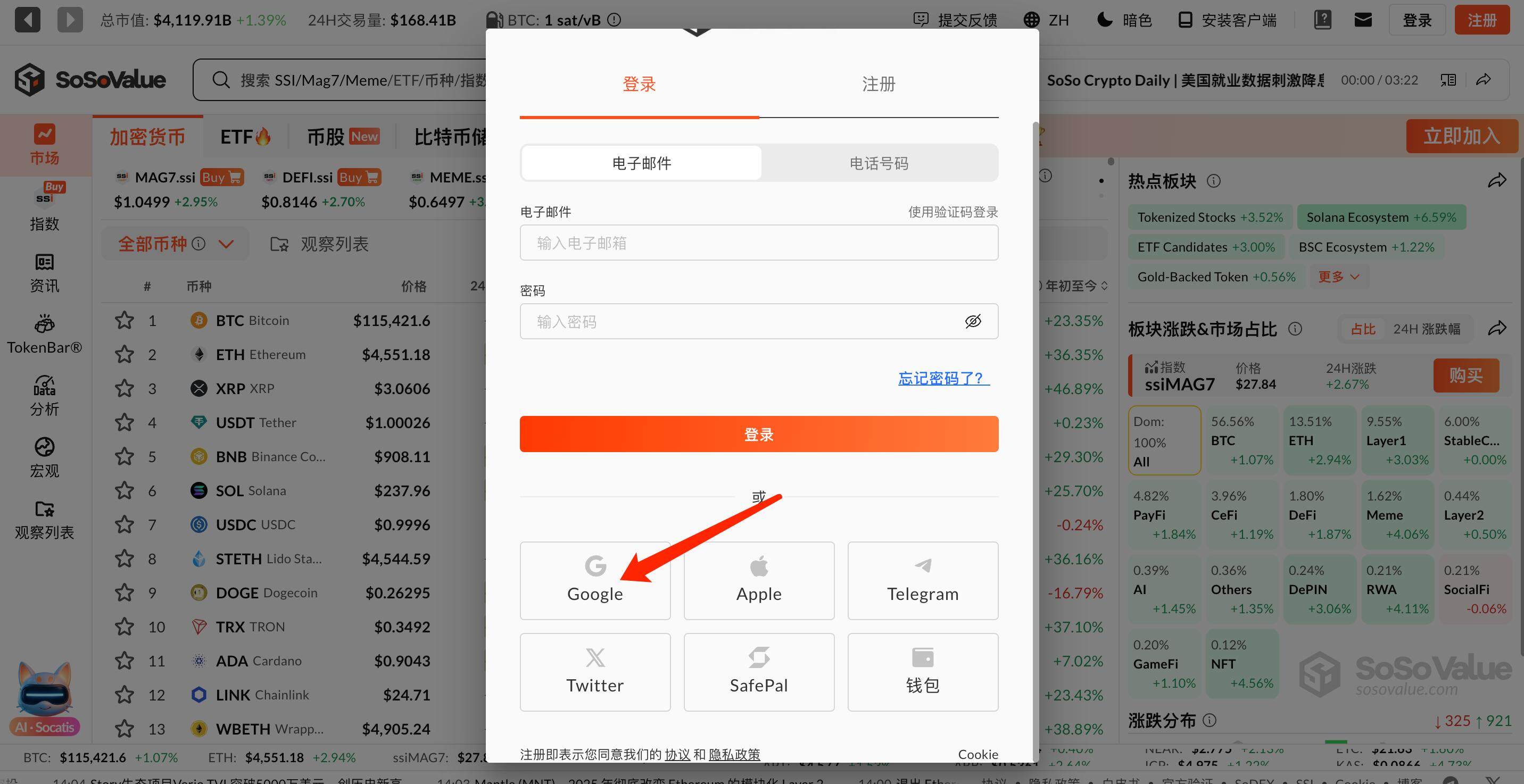 STEP 1. 进入交互网站( https://sosovalue.com/ ),使用谷歌邮箱进行登录。