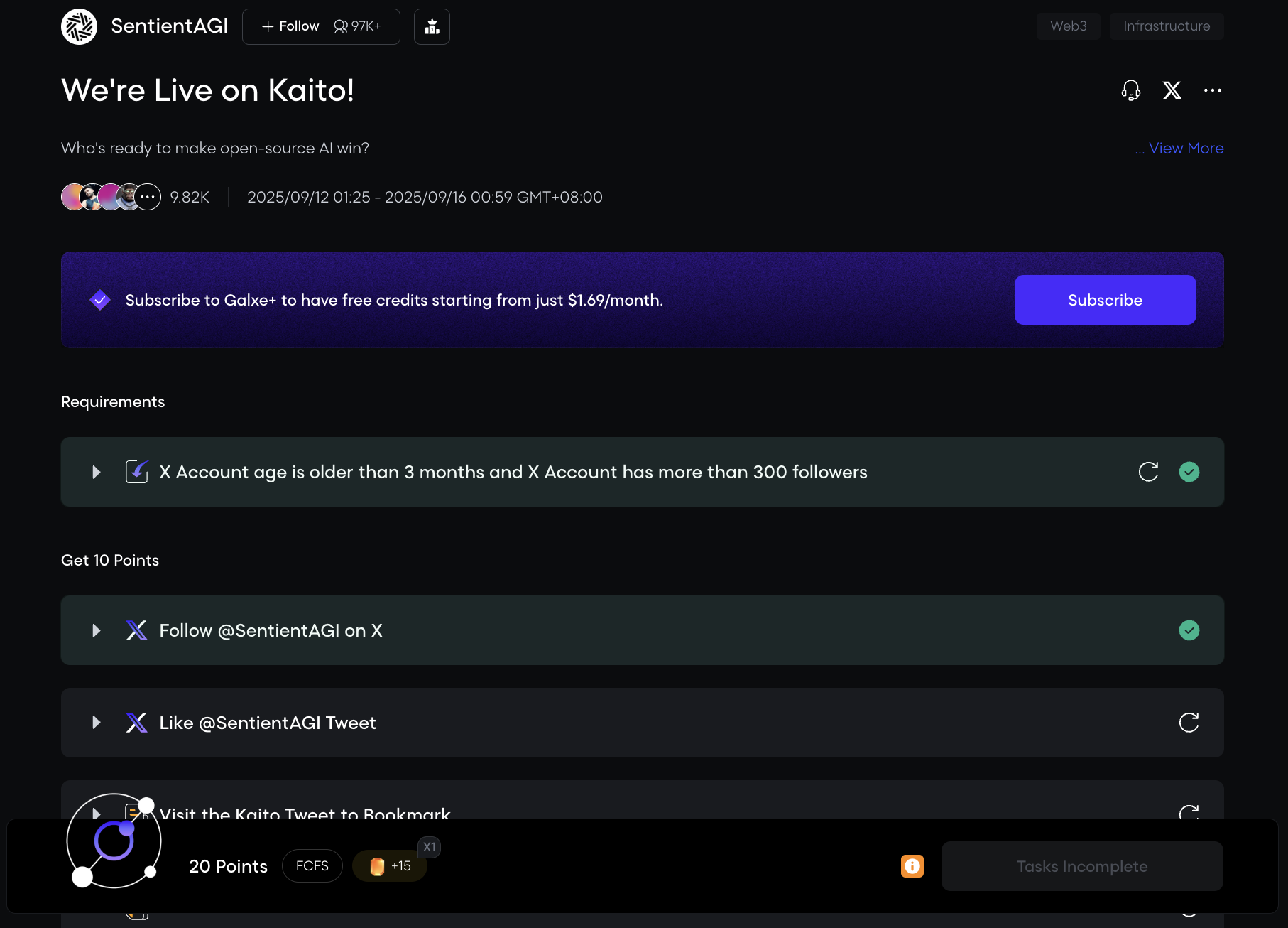 Sentient 今日在 Galxe 上线新任务,9 月 16 日截止(链接: https://app.galxe.com/quest/5pH5qUCoxjtXdLh2XMpRKT/GCVLMt6bN1 ),为社交类任务,共 20 积分,但需要 X 账户注册时长超 3 个月并且粉丝数超 300 个。